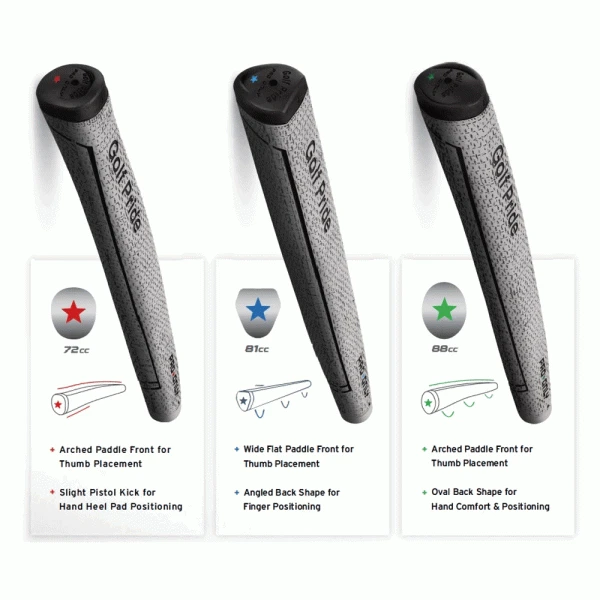 The Tour Inspired Golf Pride Pro Only Cord Putter Grips feature a brushed cotton cord for Golf Pride’s firmest, most responsive putter grips ever. Available in 3 shapes The Red Star Grip has a Tour-preferred pistol shape with an arched paddle front for thumb placement and added precision. The Blue Star grip has an angled back shape to lock in hand placement and a wider paddle front for consistent thumb positioning. & The Green Star grip has a rounded, oval back shape and a slightly arched paddle front for comfortable hand positioning and precise thumb placement.
