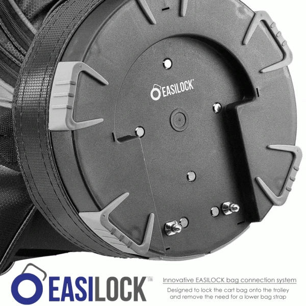 In a ground-breaking first, the exclusive EASILOCK system featured across all new Motocaddy trolleys and bags is designed to lock the cart bag onto the trolley and remove the need for a lower bag strap. Two holes on the trolleys bag support are aligned with two pins on the base of all new Motocaddy cart bags; ensuring golfers can lock their bag onto the trolley before using the upper bag strap to secure it completely. The two pins on the base of each new trolley bag are removable, so golfers have the option of taking them off to fit an older Motocaddy trolley or other branded models on the market. The trolleys are also supplied with easily detachable straps to allow them to be used with non-EASILOCK bags.