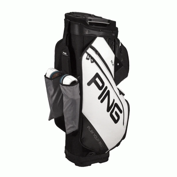 Ping DLX has been updated and made even better than the previous model, The DLX has a 15-way mesh top divider system with integrated moulded putter well. Made from a durable polyurethane material this will not only last longer but looks great on the course as well. With 14 pockets placed to maximise convenience, you will have easy access to every pocket whilst the bag is on your golf trolley. A new rubber base with cut out so this will fit onto your trolley without moving around. The DLX provides golfers with the organisation and function expected from a high-end trolley bag but with the style and quality of a tour bag.