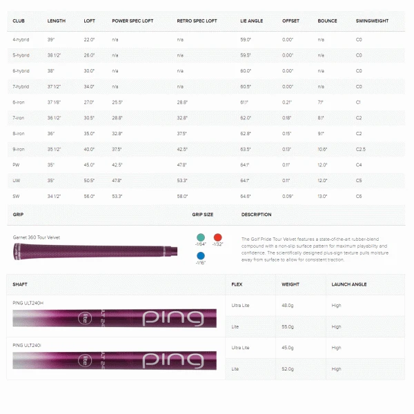 The Ping GLE Ladies Irons feature a precise and forgiving design with a lighter overall club weight, G Le2 irons utilize COR-Eye Technology with a deep top-rail undercut to increase face flexing for more ball speed and higher max height. A tungsten toe weight helps increase MOI by 10% for greater forgiveness and a co-molded cavity badge ensures a pleasing feel and sound. Fitted with a lighter, super-soft Golf Pride Tour Velvet 360 grip in an attractive garnet color is standard with G Le2. Ping’s proprietary ULT240 Lite and Ultra Lite premium graphite shafts help bring down overall club weight while helping you generate more clubhead speed and ball velocity with no greater effort. The Power Spec is a custom-designed loft configuration that delivers a power boost in a calculated fashion without sacrificing the integrity of the club’s design.
